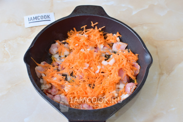 Следом выложите к бекону морковь и лук. Смешайте все вместе. Обжарьте еще 3-5 минут.