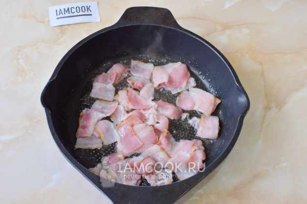 Горячую сковороду полейте растительным маслом. Выложите и обжарьте бекон пару минут.