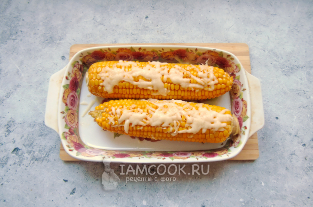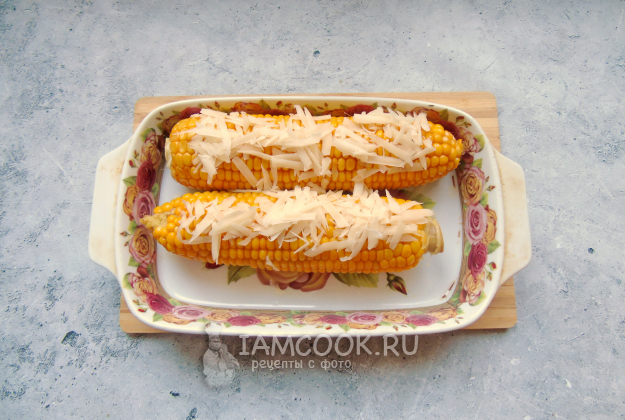 Запекайте кукурузу в духовке, разогретой до 190 градусов, 40-45 минут. После достаньте её из духовки и посыпьте тертым сыром.
