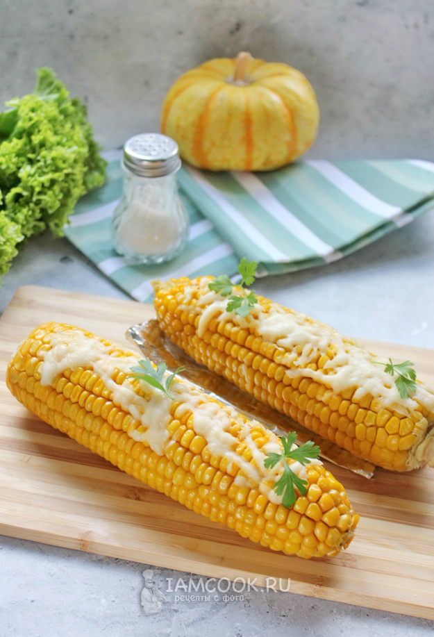 Кукуруза, запеченная в духовке с сыром, готова к подаче на стол. Ароматная и очень вкусная.