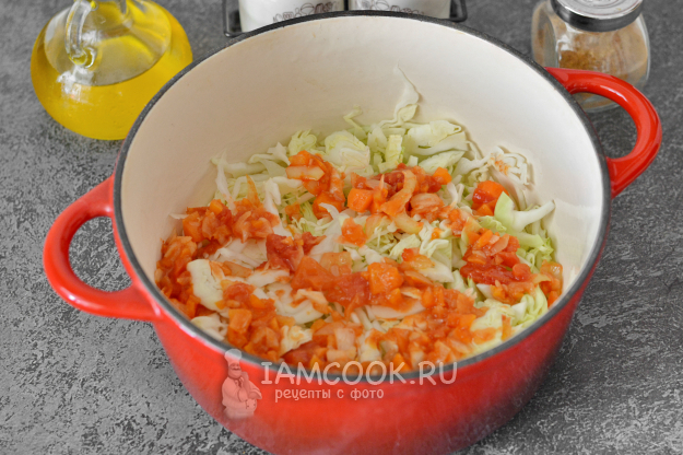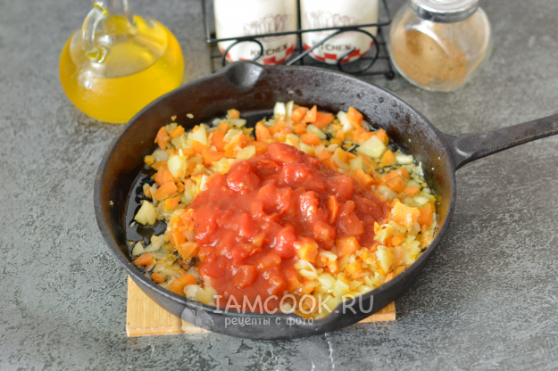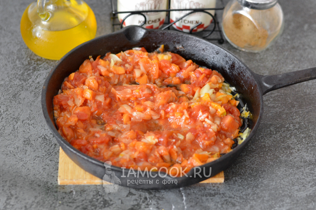 Разогрейте в сковороде масло, слегка поджарьте лук и морковь, добавьте томаты в собственном соку, хмели-сунели.