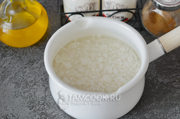 Нужно также предварительно отварить рис до полуготовности. Для этого сухой рис залейте водой и варите примерно 10 минут, откиньте на сито и остудите.