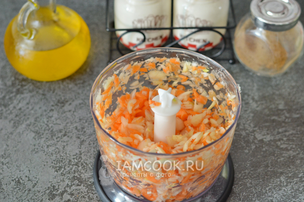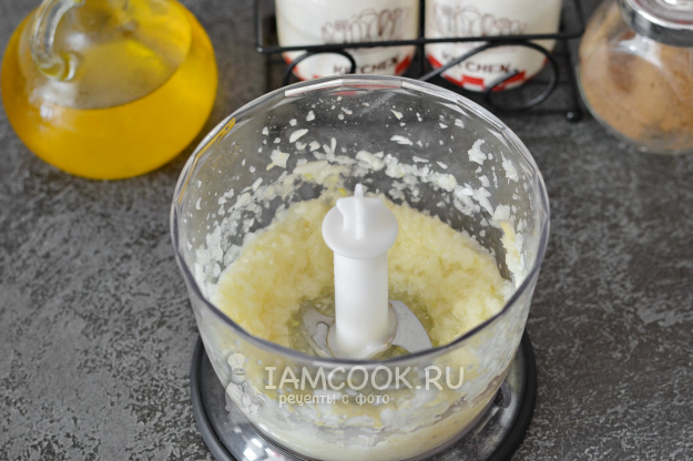 Лук натрите на тёрке или измельчите в блендере в пюре.