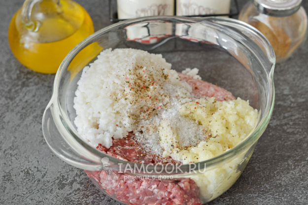 И вот теперь к фаршу добавьте отваренный рис, измельченный лук, соль и перец.