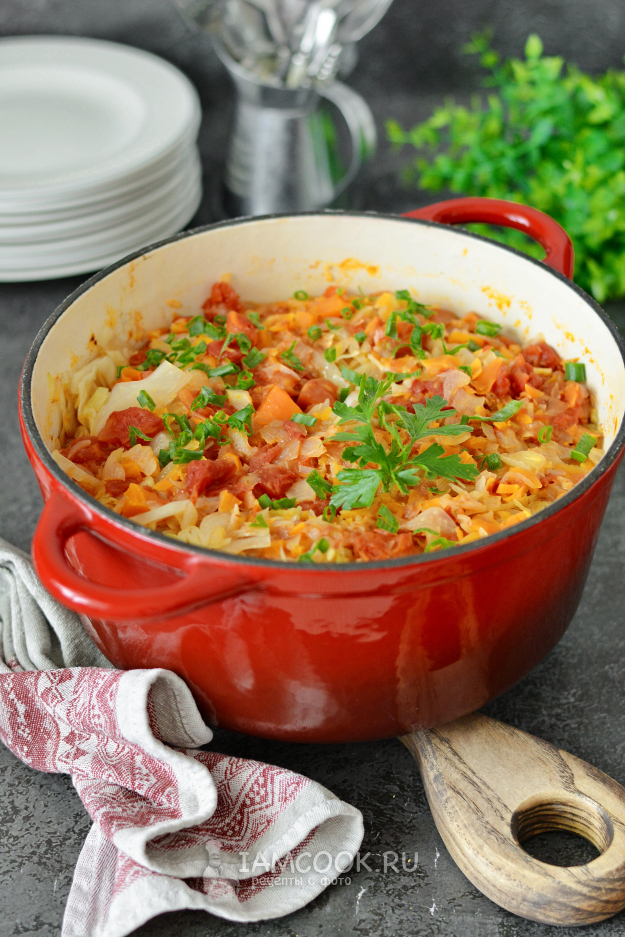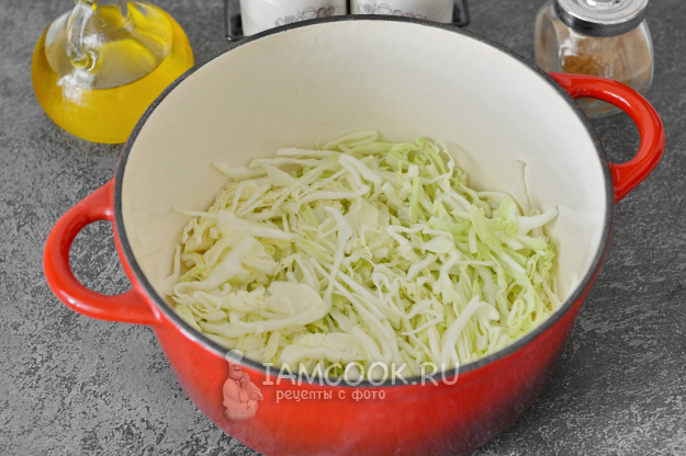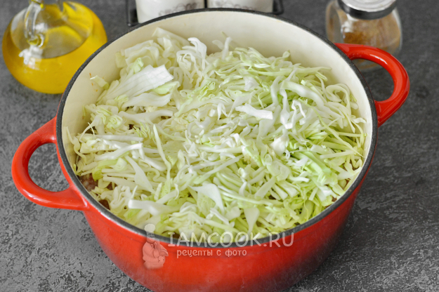 Тушить их лучше всего в глубоком казане, толстостенной кастрюле или сотейнике. На дно кастрюли (казана) выложите половину нашинкованной капусты.