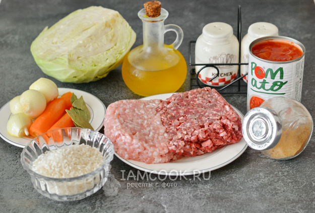 Соберите все продукты по списку для приготовления ленивых голубцов с тушеной капустой.