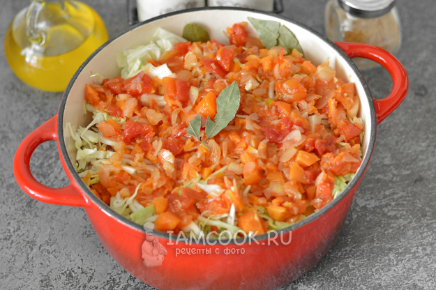 Что касается томатной составляющей, то тут возможны варианты. Я использовала томаты в собственном соку кусочками. Бабуля обычно использовала в зажарку томатный соус типа "Краснодарского" или просто томатную пасту, а сверху добавляла нарезанные кружочками помидоры. Либо просто использовала много нарезанных помидоров (в сезон).