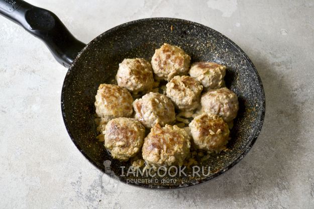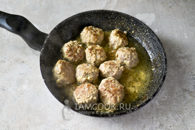 Обжарьте фрикадельки на среднем огне в течение 7-8 минут. Во время обжаривания переворачивайте фрикадельки, чтобы они обжарились со всех сторон до легкой румяной корочки.