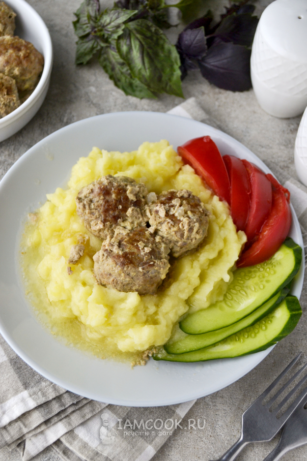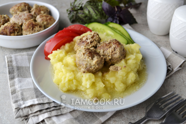 Соберите продукты для приготовления картофельного пюре с фрикадельками.