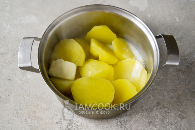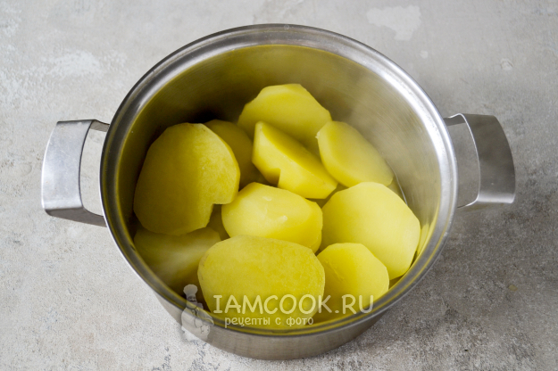 Очистите картошку, залейте ее холодной водой и поставьте кастрюлю на огонь. После закипания сделайте огонь средним, посолите и варите картофель до готовности. С вареной картошки слейте отвар.