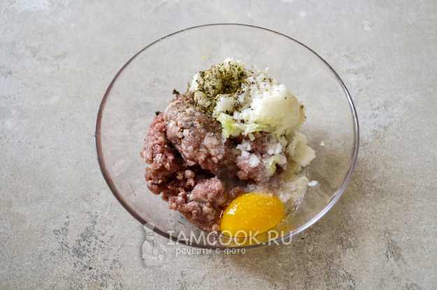 В глубокую миску положите мясной фарш, мелко нарезанный репчатый лук, разбейте яйцо, посолите и поперчите. Тщательно вымешайте все ингредиенты.