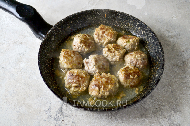 Когда фрикадельки будут слегка обжарены, влейте в сковороду горячую воду.