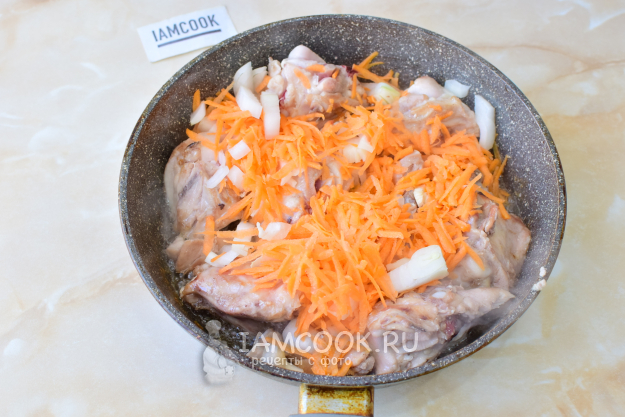Морковь с луком выложите в сковороду к курице. Перемешайте. Обжаривайте все вместе 3-5 минут.