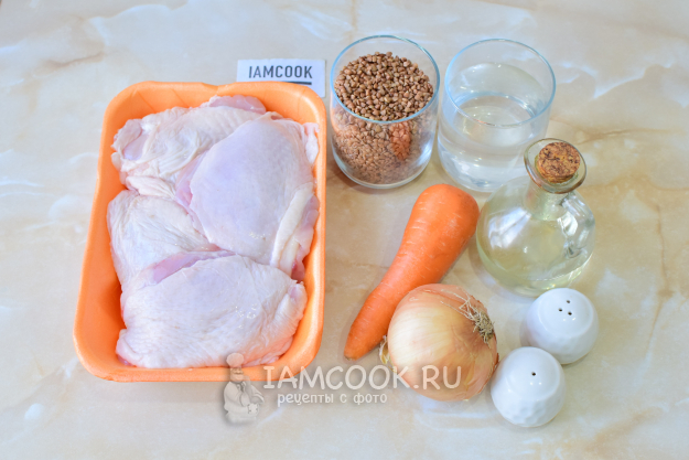 Для приготовления гречки с курицей с подливкой на сковороде соберите все продукты по списку. Можно готовить любые части курицы. Я беру куриные бедра. Но можно взять и филе без костей.