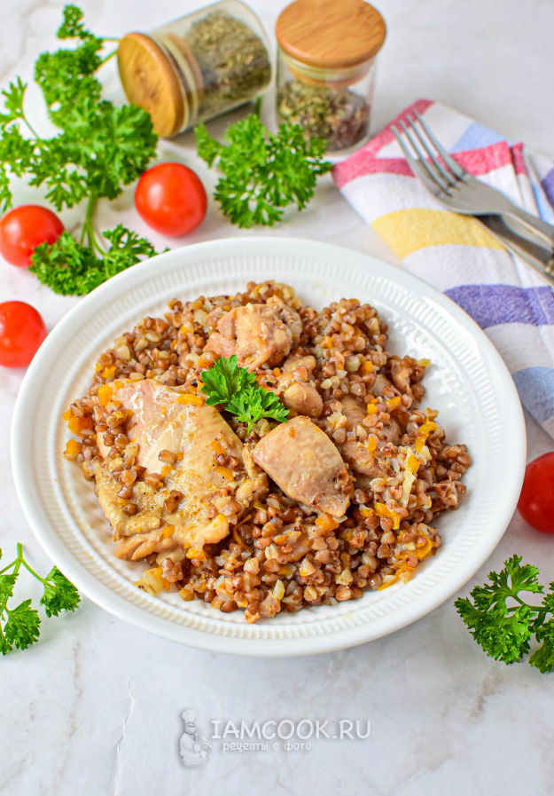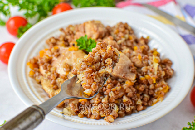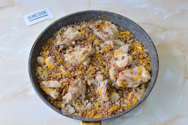 Гречка с курицей и подливкой на сковороде удалась! Разложите по тарелкам и подавайте к столу.