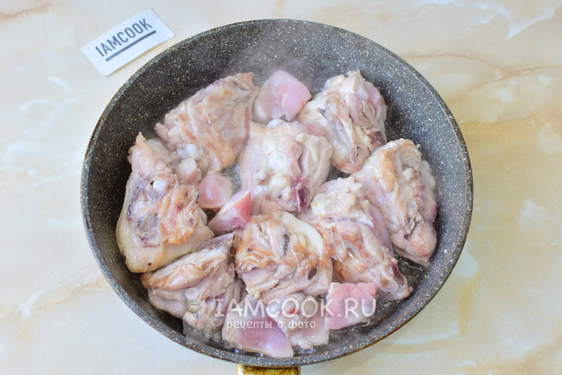 Порубите курицу небольшими кусочками и выложите в горячую сковороду. Обжарьте её с добавлением небольшого количества растительного масла 8-10 минут. Курица начнет румяниться.