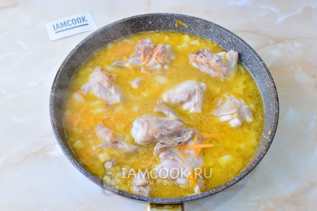 Затем залейте курицу горячей водой. Посыпьте солью и специями. Тушите курицу в подливе 20-25 минут.