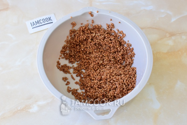 Гречневую крупу несколько раз промойте в холодной воде. Затем откиньте на ситечко и дождитесь, чтобы лишняя вода стекла.