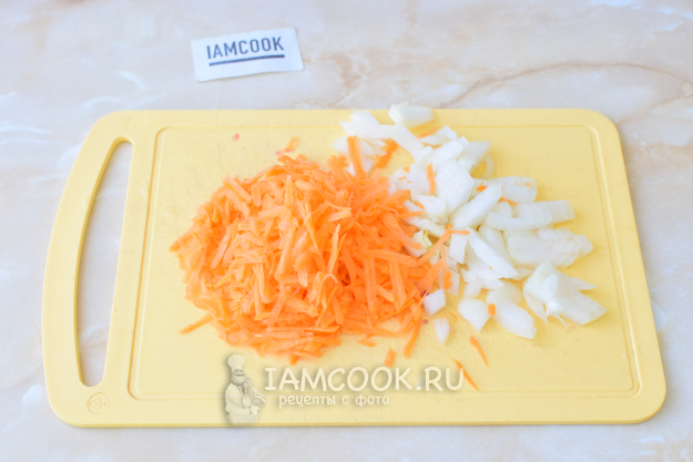 Отдельно очистите морковь с луком. Морковь потрите на терке. А лук не сильно мелко нарежьте.