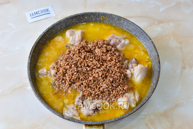 Затем выложите промытую гречку. Доведите до кипения. И готовьте её под крышкой 10 минут. Затем снимите сковороду с огня и оставьте постоять, не открывая, еще минут 15. За это время гречка дойдет, но не разварится. Большую часть воды она в себя впитает, но часть подливы останется на дне сковороды. За счет этого гречка будет сочной.