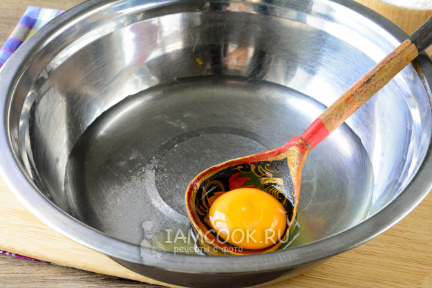 Влейте воду в глубокую миску, всыпьте туда 0,5 ч. л. соли и вбейте куриное яйцо. Всё хорошенько перемешайте, можете воспользоваться венчиком.