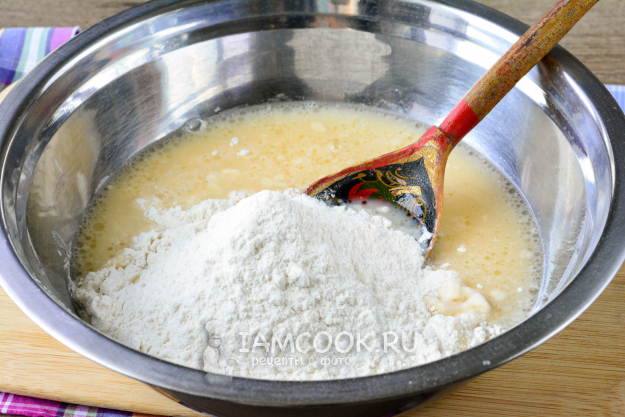 Всыпайте пшеничную муку частями и начните замешивать тесто.