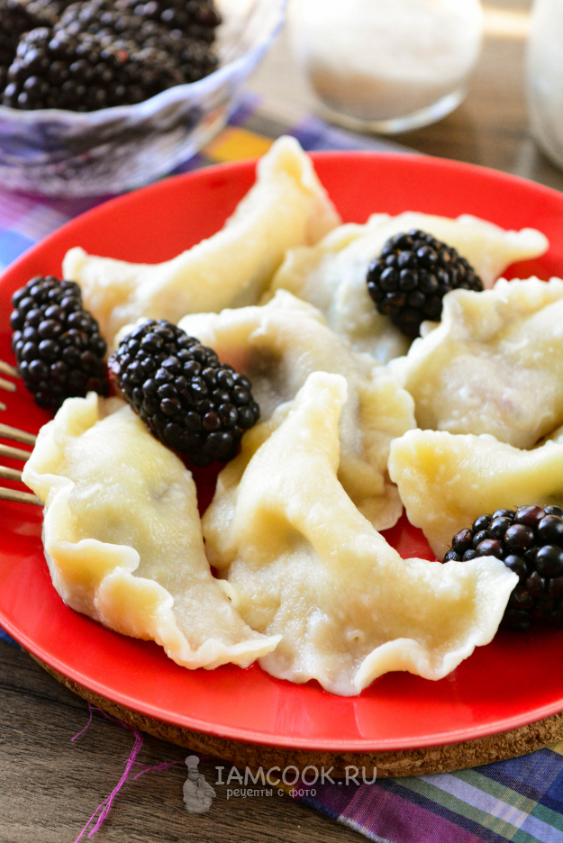 Готовые вареники с ежевикой сразу подавайте к столу. Их можете присыпать сахаром или полить растопленным сливочным маслом.