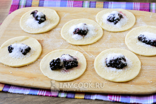 Затем тесто тонко раскатайте и выдавите в нем кружочки диаметром примерно 6 см. В центр каждого кружка выложите по ягоде ежевики и добавьте сахар по вкусу. Если ежевика слишком крупная - разрежьте ее.