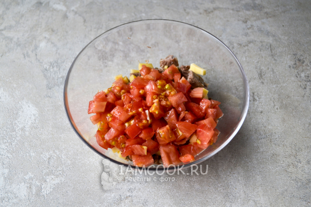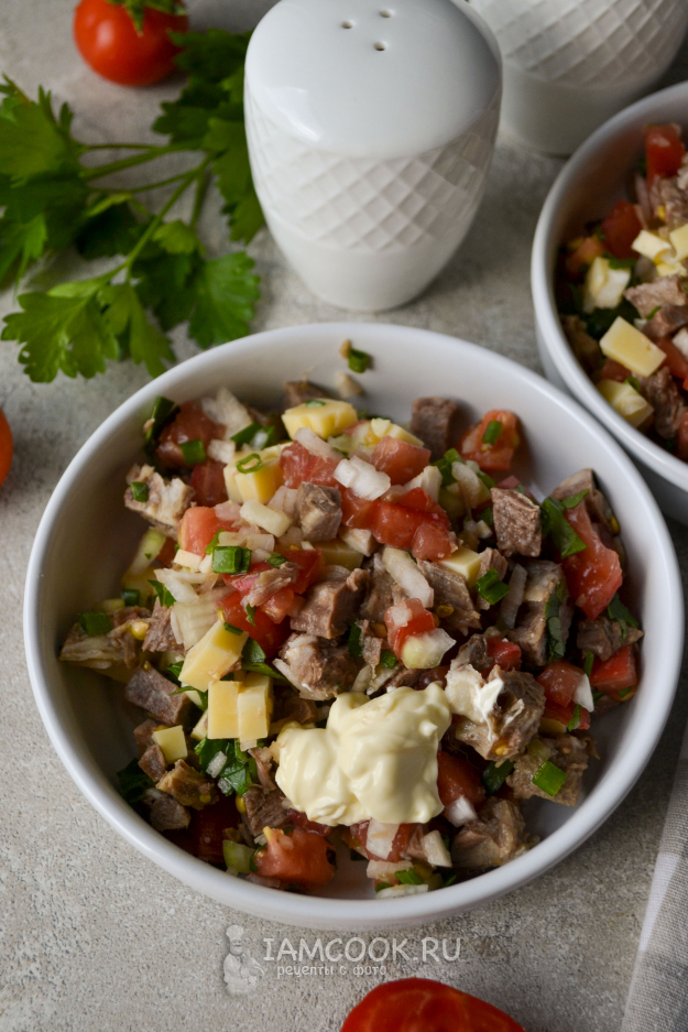 Гусарский салат с говядиной и помидорами готов. Подавайте его порционно, добавив майонез. Приятного аппетита!