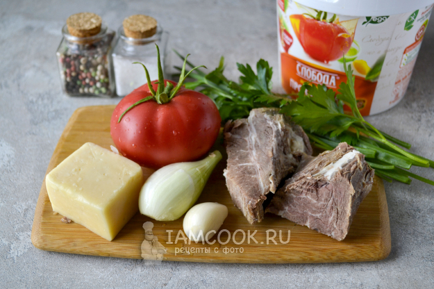 Продукты для приготовления салата «Гусарский» с говядиной и помидорами подготовьте по списку.
