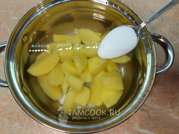 Картошку почистила, помыла, разрезала на части, чтобы она быстрее сварилась. Заливаю горячей водой, добавляю соль и варю на слабом огне 25-30 минут до готовности. Готовая картошка легко протыкается вилкой или ножом.