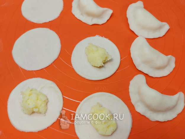Выкладываю начинку по центру - около 2/3 чайной ложки, хорошо защипываю и формирую вареники.