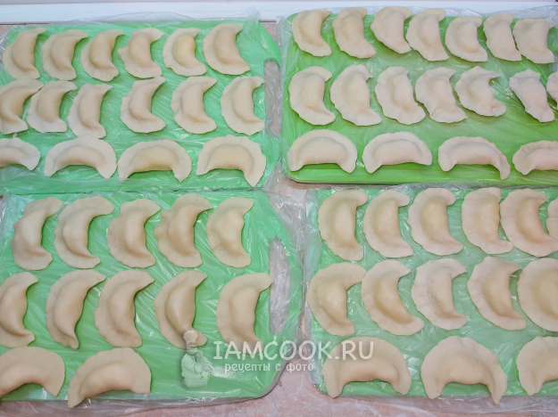 Готовые вареники с картошкой без лука выкладываю на разделочные доски, застеленные пищевой плёнкой или фасовочными пакетами. Убираю в морозилку до полной заморозки, потом можно переложить их в пакет.