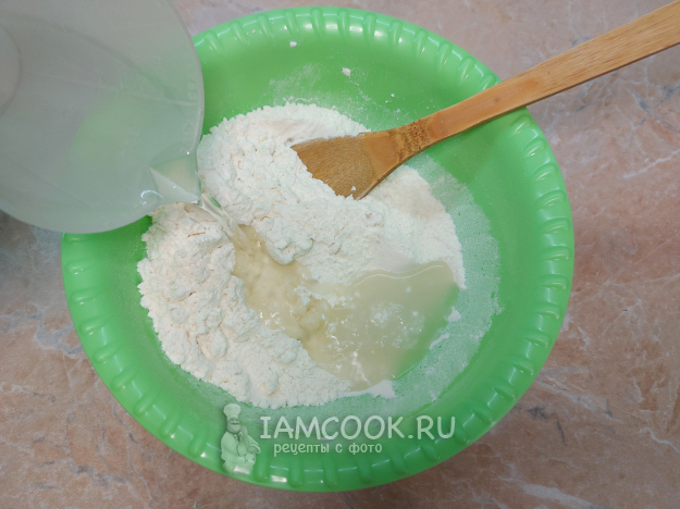 Вливаю кипяток, интенсивно мешая лопаткой.