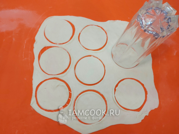 Вырезаю кружочки с помощью стакана, оставшееся тесто использую в следующей партии.