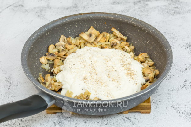 Выложите сметанную смесь к грибам. Добавьте соль и перец.