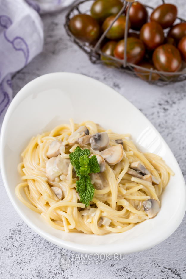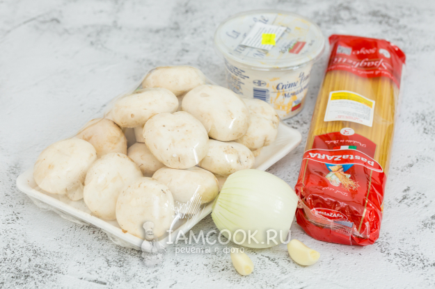 Для приготовления спагетти со сливочно-грибным соусом соберите продукты по списку.
