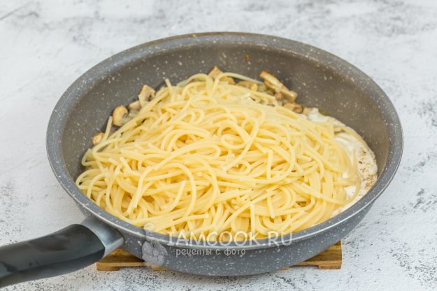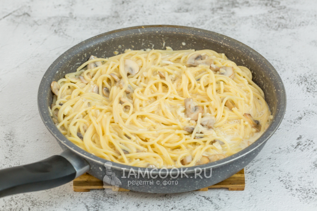 Блюдо получается вкусным! Но если будете готовить спагетти лишь с шампиньонами, не ждите фееричного вкуса, потому как шампиньоны - грибы нейтральные по вкусу. А вот если у вас есть сушеные белые, будет отлично, если добавите немного и этих грибов - хватит буквально 10-15 граммов. Их необходимо залить кипятком, а спустя 10-15 минут воду слить (можно добавить ее в воду, в которой будете варить спагетти), а грибы нарезать и обжарить их вместе с шампиньонами.