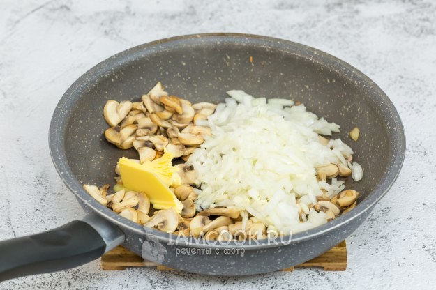 Затем добавьте подсолнечное и сливочное масло, а также нарезанные мелко лук и чеснок.