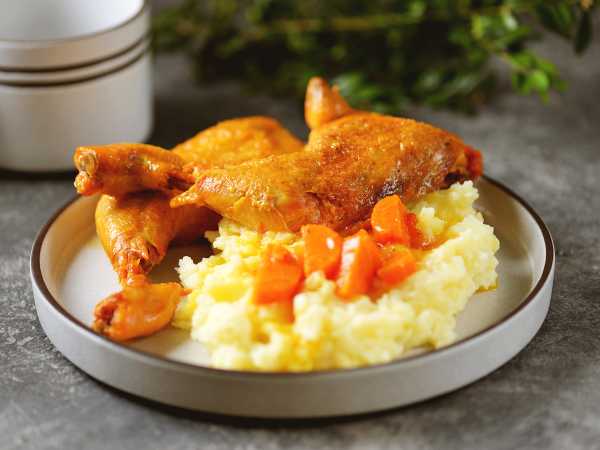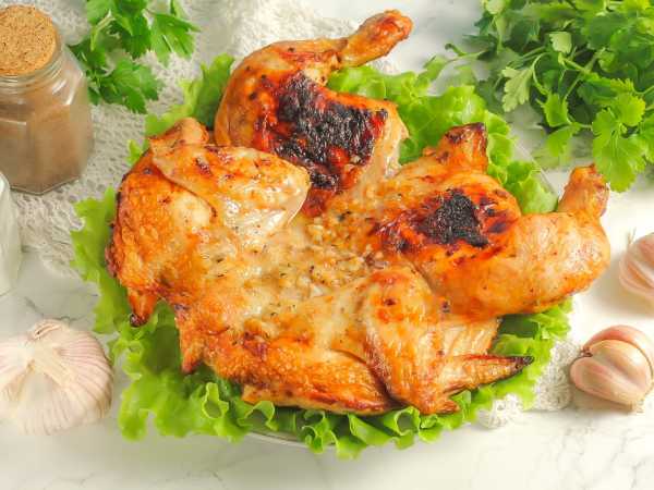 После запекайте курицу в майонезе и соевом соусе в духовке, разогретой до 200 градусов, 45-50 минут, до золотистой корочки.