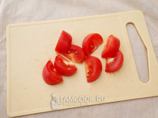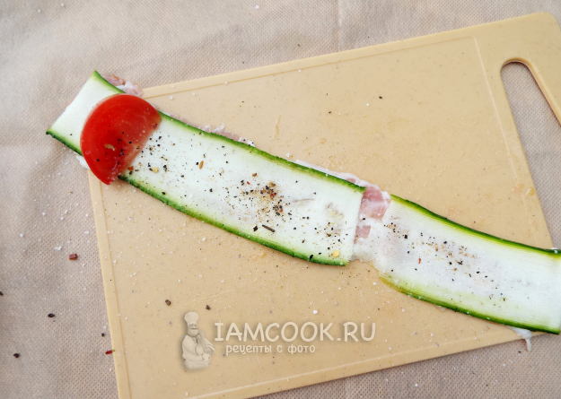На полоску бекона выложить один или два слайса кабачка, немного посолить и поперчить, на край разместить помидор.