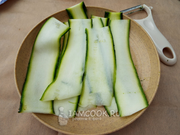 Кабачок - тонкими полосками (удобно использовать овощечистку).