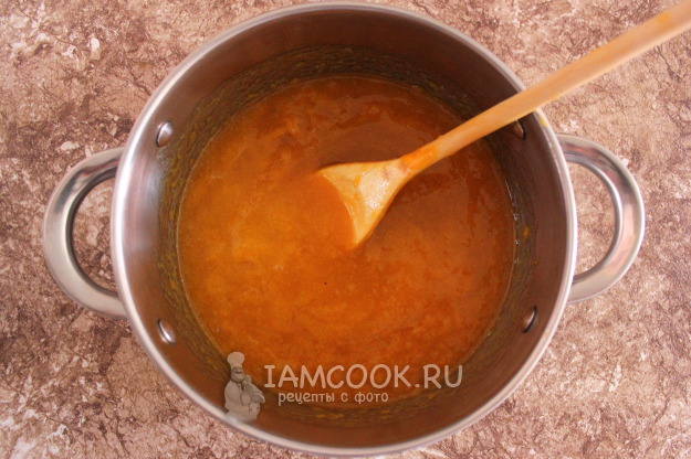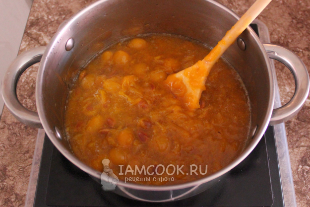 Доведите до кипения, убавьте огонь до среднего и варите до мягкости и начала отделения косточек. На это понадобится 15-20 минут. Периодически помешивайте деревянной ложкой. Кстати, такая ложка очень нужна, чтобы до руки не долетали брызги во время варки.