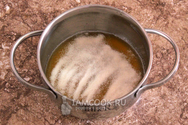 Соедините эту кислую фруктовую воду с желатином и нагрейте до 60 градусов при помешивании. Желатин должен раствориться.