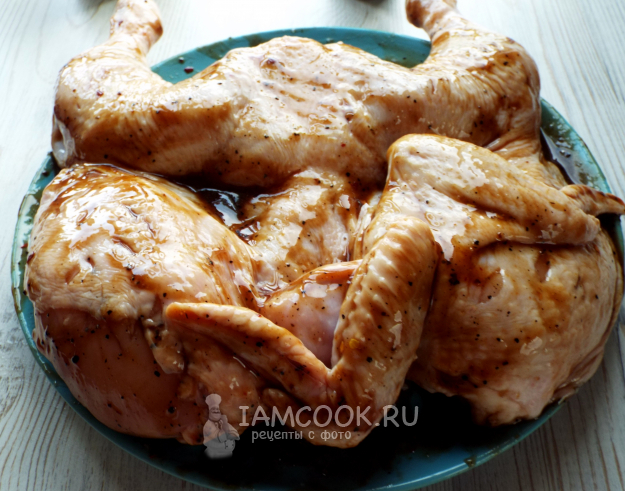 Тщательно обмазать всю курицу маринадом.