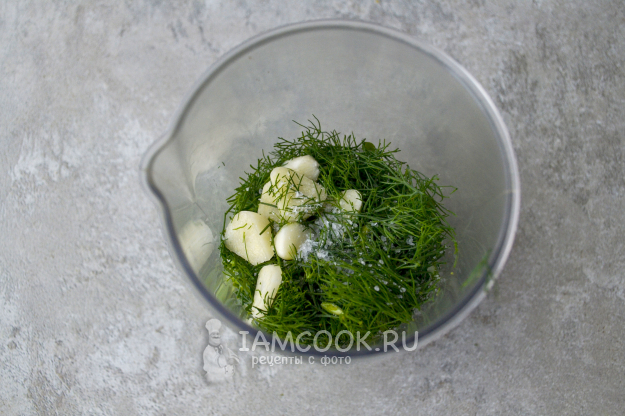 В стакан блендера положите нарезанный лук, чеснок и укроп, посолите.