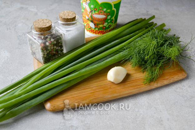 Соберите продукты для приготовления соуса из зеленого лука и укропа по списку. Зеленый лук и укроп промойте и обсушите, чеснок очистите.