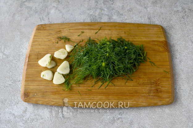 Нарежьте укроп и зубчик чеснока.