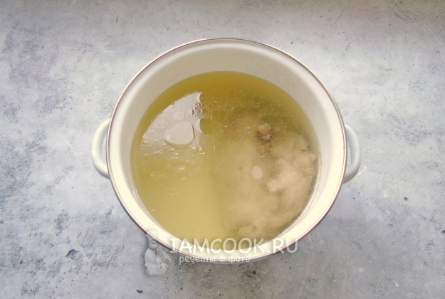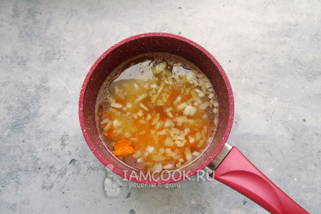 Добавьте лук с морковью и налейте 1 литр бульона индейки.