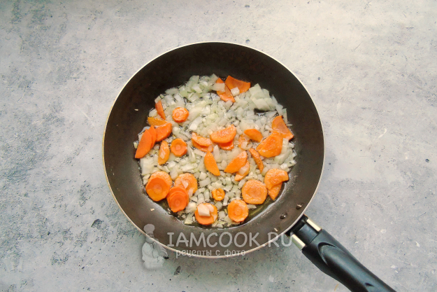 На сковороду выложите нарезанные мелко лук и морковь. Морковь можно натереть на терке. Налейте подсолнечное масло и пассеруйте овощи 7-8 минут.